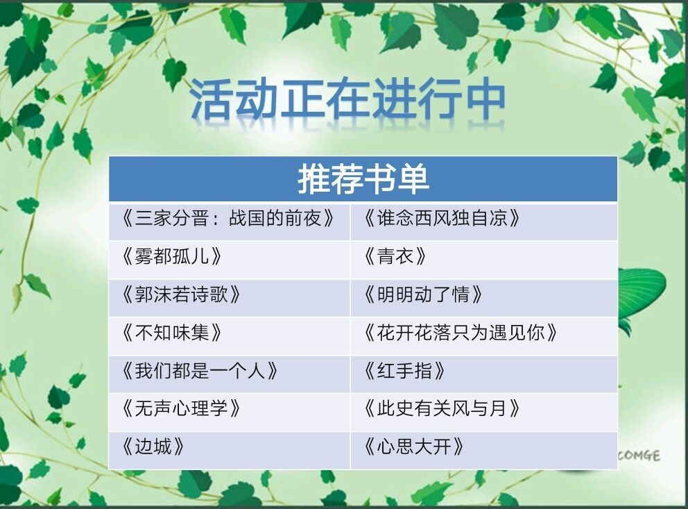 为使同学们能够利用自己的时间走进书中,养成良好的校园读书氛围,提升师生审美情趣和人文底蕴;同时,充分发挥图书馆文化阵地的作用,积极参加大学文化的建设工作,以此推动我院师生阅读学习的新高潮。图书馆于5月9日~11日于图书馆一楼朗读室举办了为期三天的“阅动三全”读书打卡活动。各书院各专业的500余名同学参加了此次活动。 此次活动旨在让同学们从自身的角度出发向其他同学发出对自己喜欢的一本书籍的推荐,让更多的同学可以了解到书籍的魅力,加深自己多读书的热爱。从5月9日上午9点第一个同学来到朗读室签到开始,这股读书的浪潮就在图书馆内涌动,与朗读室内的盆景相映成趣。活动采用了打卡签到的模式,每位参加活动的同学在这三天里都需要在朗读室内完成一小时的读书打卡,并将自己所读书籍的名称写在服务台旁边的白板上。从早上九点活动开始一直到晚上八点结束,学生络绎不绝,朗读室内的读书声源源不断,学习氛围浓厚,工作人员同样一直在岗,在服务台随时准备为参加活动的同学解决困惑。同时,为了让更多的同学感受到这份魅力,工作人员还特别制作了“阅动三全”活动流程和注意事项PPT在图书馆内播放,并在活动进行中时及时更新,将同学们的推荐书单也放进了PPT中。同学们在经历了三天的读书打卡之后会向图书馆内的值班人员提交一份书籍的推荐表,而再由我们作为一座桥梁将这份推荐送至山区的孩子们手中。 此次活动的举办,反响热烈,好评如潮,极大的激发了学生的阅读兴趣,帮助学生培养良好的阅读习惯,发挥了朗读室的价值。为图书馆的建设和学生阅读习惯养成都有重大深远的意义。