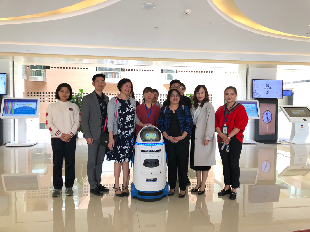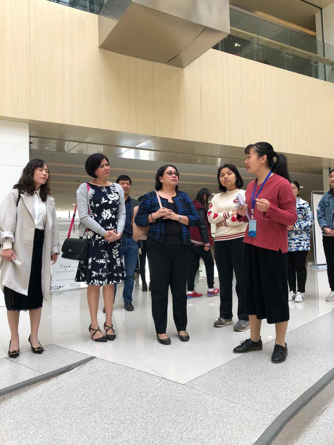 2018年10月23日上午,菲律宾圣保罗大学马尼拉校区(St. Paul University Manila)教学副校长Dr. Dychangco M. Atilano,护理学院院长 Dr. Olivar J. Ramelb,一步教育公司创始人孟兵和一步教育河南办公室主任郝晓凤一行人在我校王彦杰院长的陪同下,前来参观图书馆。图书馆读者服务部主任陈燕及图书馆讲解队英文讲解员张丹彤、林群热情接待了来访客人。 陈燕及两名外语讲解员先与来访参观人员在图书馆中庭合影留念。随后,讲解员全程用英文为来访客人讲解了图书馆二楼的信息共享空间、现刊阅览室、研修室,三楼的医学文献阅读区,并向外宾演示了五楼的学术报告厅、多媒体放映室和艺术欣赏厅的使用等。在参观过程中,陈燕及外语讲解员就图书馆设计理念、功能布局及读者规章制度与来访人员进行了探讨交流,并对外宾们的提问进行了逐一的回答,给外国友人留下了清晰全面的图书馆印象。 此次参观活动,不仅搭建了我校与国外友人良好地学习交流平台,也加强了外界对我校图书馆的认识和了解。