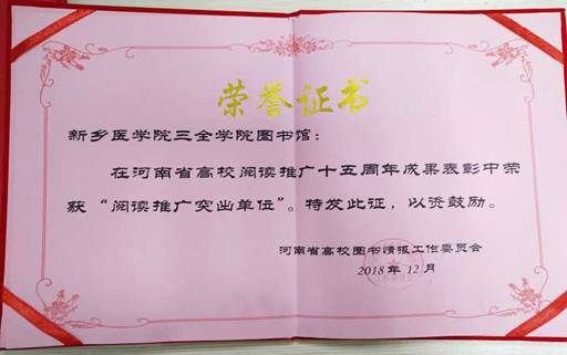 书香圣地受肯定 作为高校的图书馆,这里是知识的殿堂,是书籍的摇篮,更是人才的供给站。在图书馆里,我们收获的不仅是知识与技能,更是心灵的抚慰。在这里,阅读受到推广,知识得以传递。佳节来临,新乡医学院三全学院图书馆在河南省高校阅读推广十五周年成果表彰中荣获“阅读推广突出单位”,这是对我校图书馆的肯定,也是对阅读精神的赞扬。崭新的2019年,我校图书馆定会收获更多肯定,也会给学院学子们呈现出更温暖的港湾。