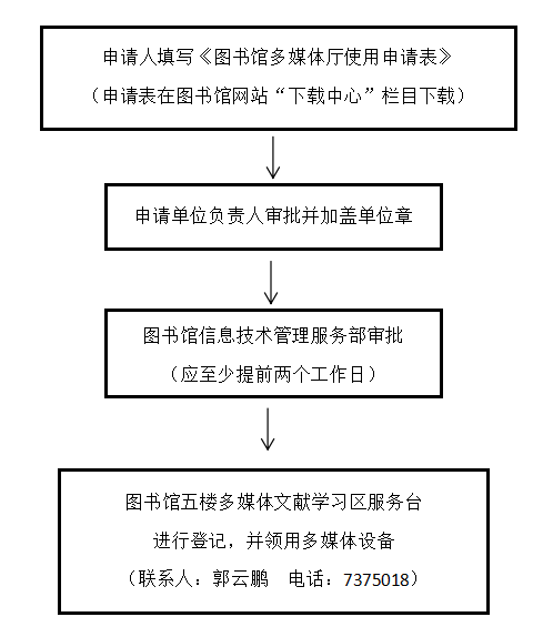图书馆多媒体厅使用申请审批流程图 |