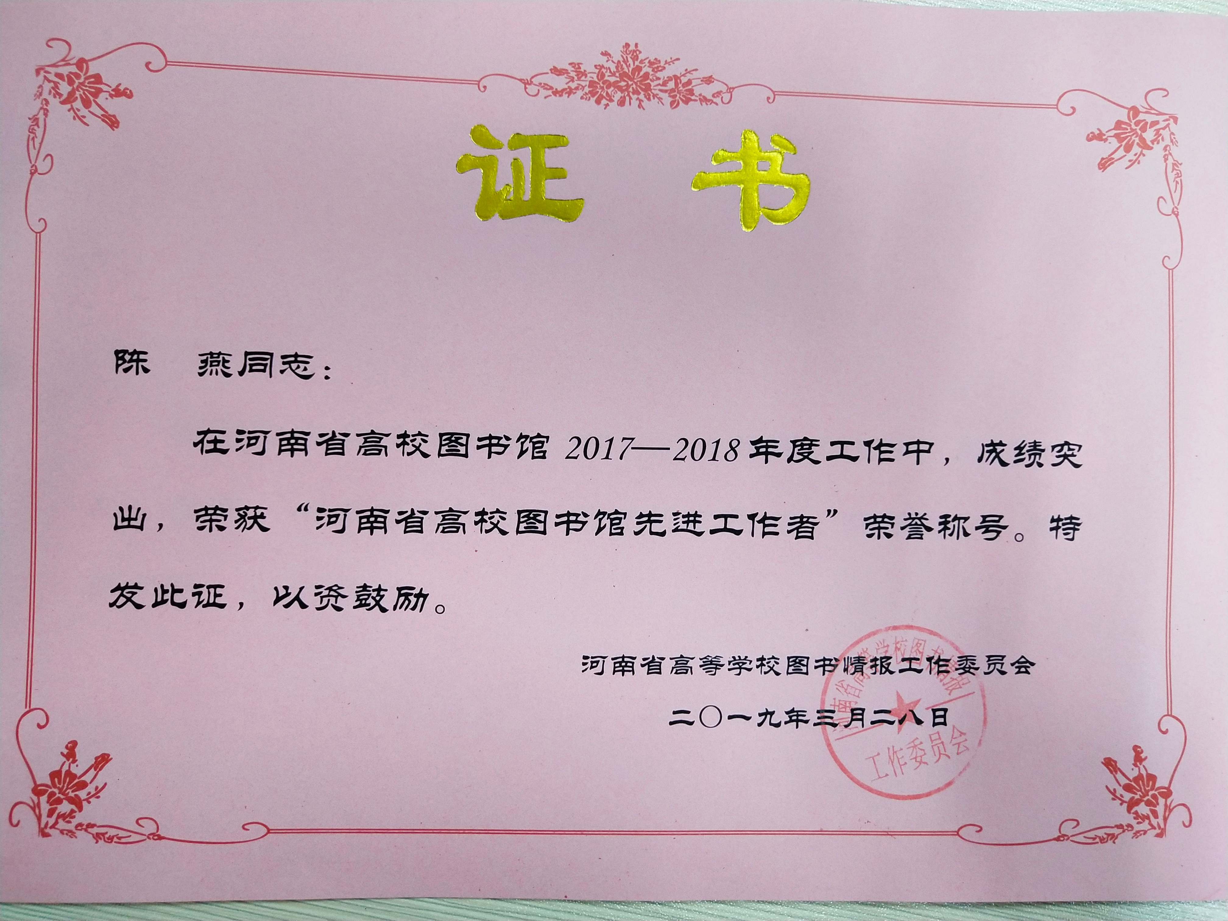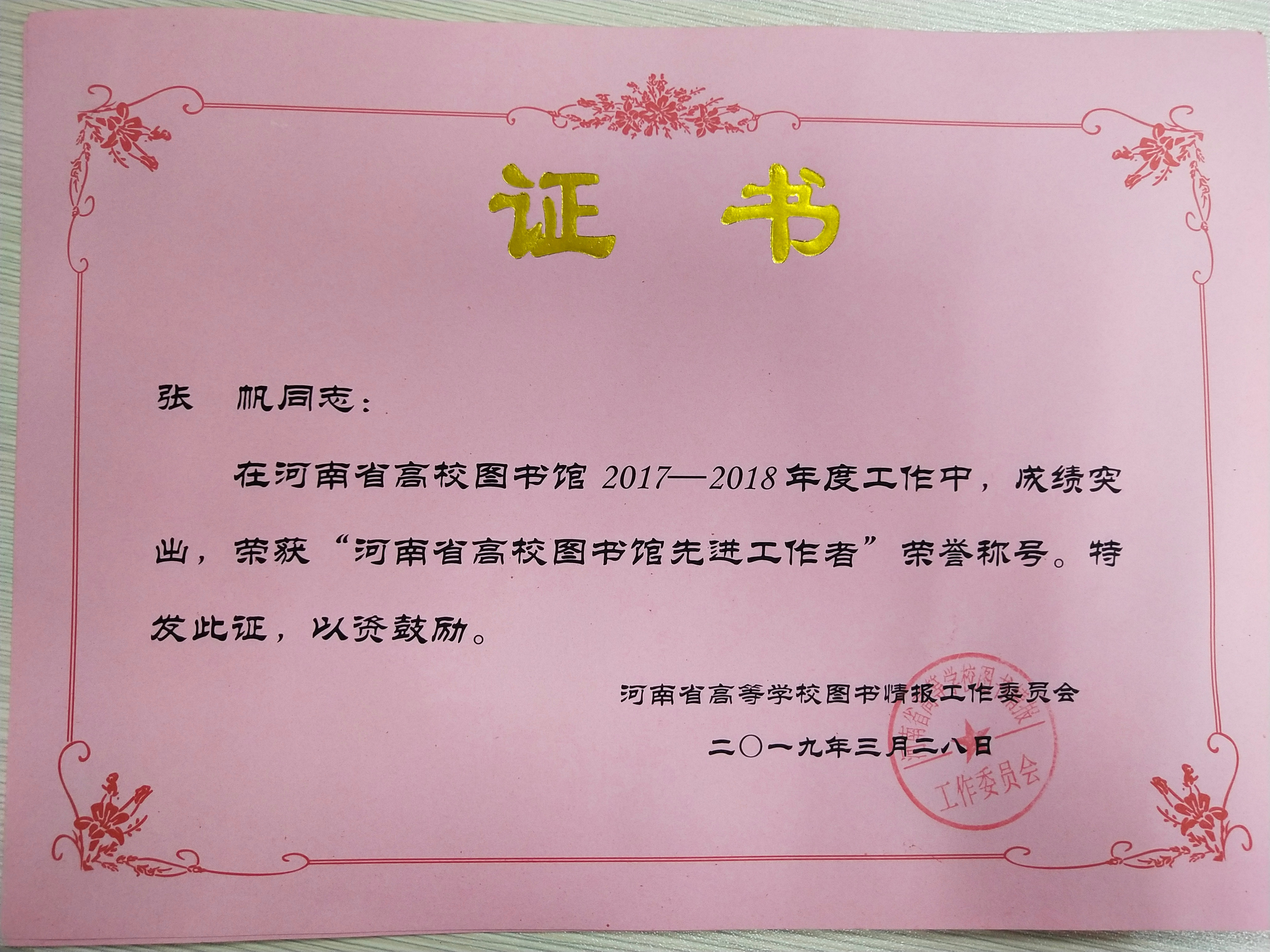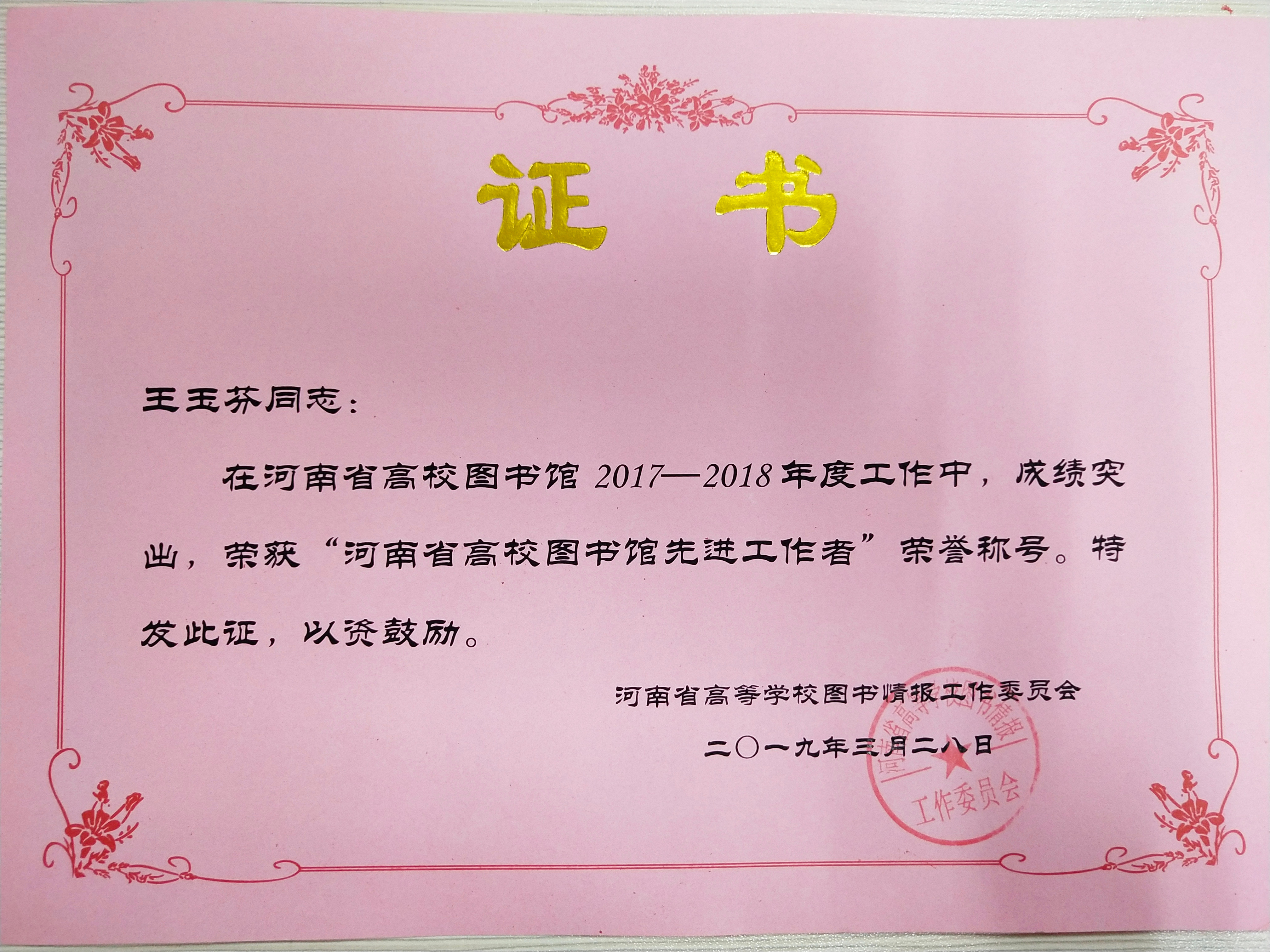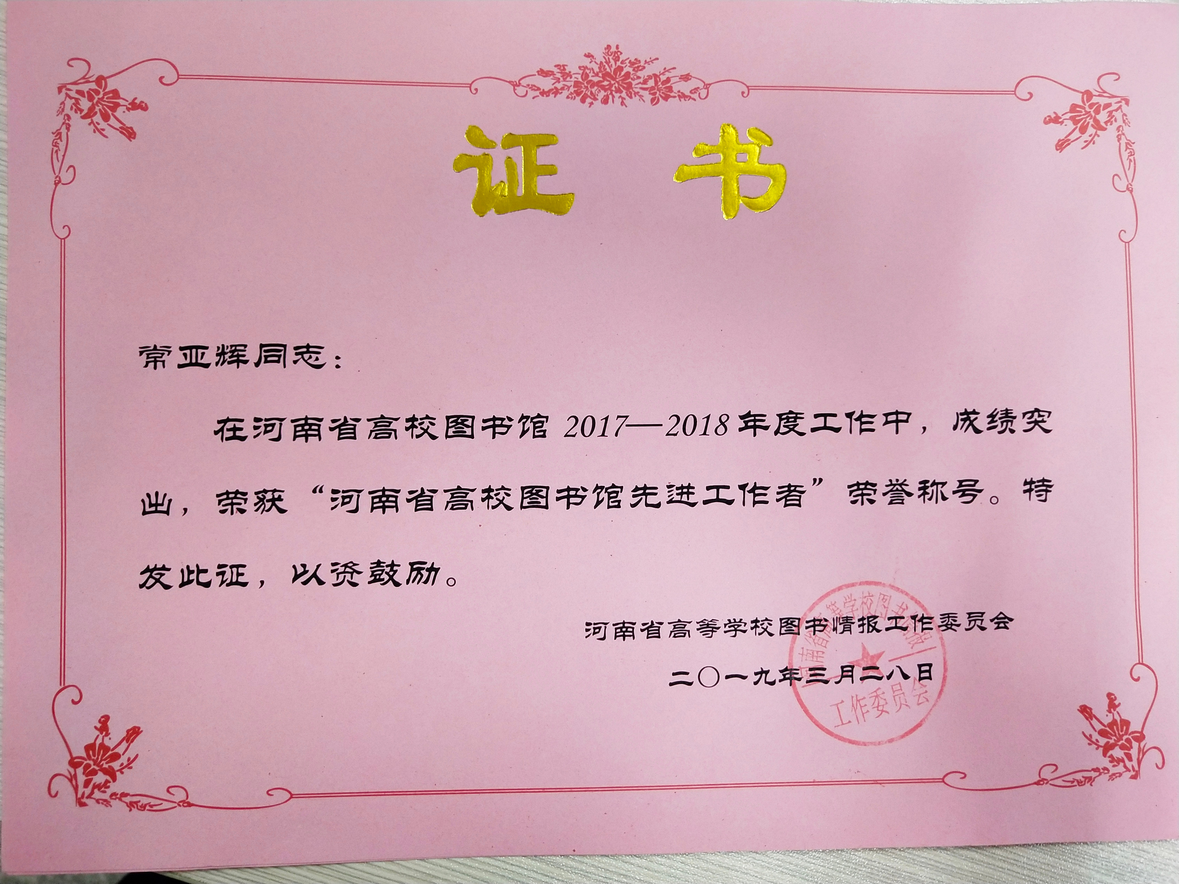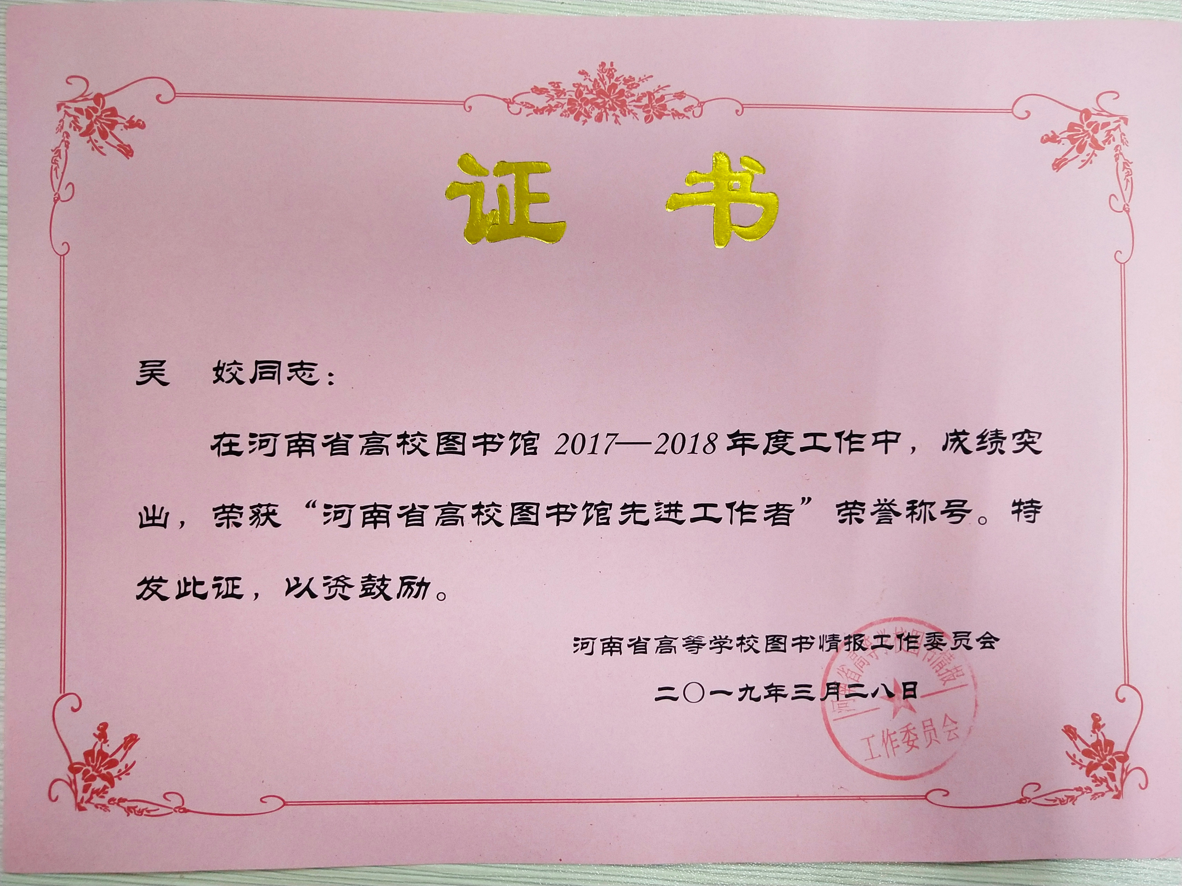 根据河南省高等学校图书情报工作委员会豫高校图工委【2019】05号“关于对河南省高校图书馆‘先进工作者’的表彰决定”文件精神,在2017-2018年度河南省高校图书馆工作中,新乡医学院三全学院图书馆及馆员在学院及党委的带领下,深入贯彻落实党的十九大精神,积极拓展和不断创新读者服务与阅读推广模式,在工作中涌现出许多甘于奉献、成绩突出的先进个人,图书馆副馆长张帆、馆员陈燕、王玉芬、吴姣、常亚辉荣获“河南省高校图书馆先进工作者”荣誉称号,以表彰他们工作中锐意进取、开拓创新,为图书馆建设发展做出的重大贡献。 我馆广大工作者将以先进个人为楷模,继续紧跟学校整体步伐,不断努力、艰苦奋斗,在实战中成长,在积累中创新,充分了解广大读者的需求,完善图书馆工作制度,做好服务科研、服务师生、服务三全的工作,使我校图书馆成为更加完善的开放型现代信息化图书馆!