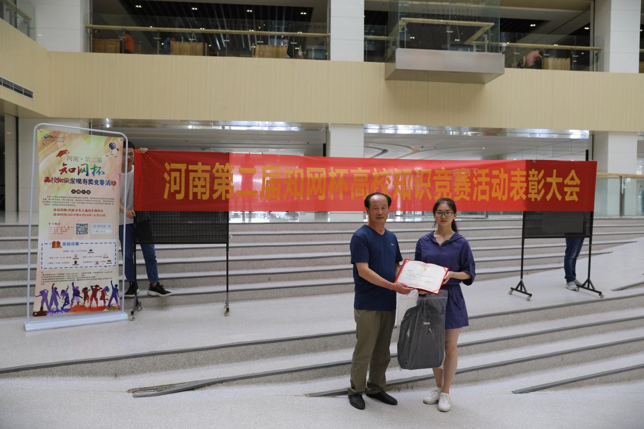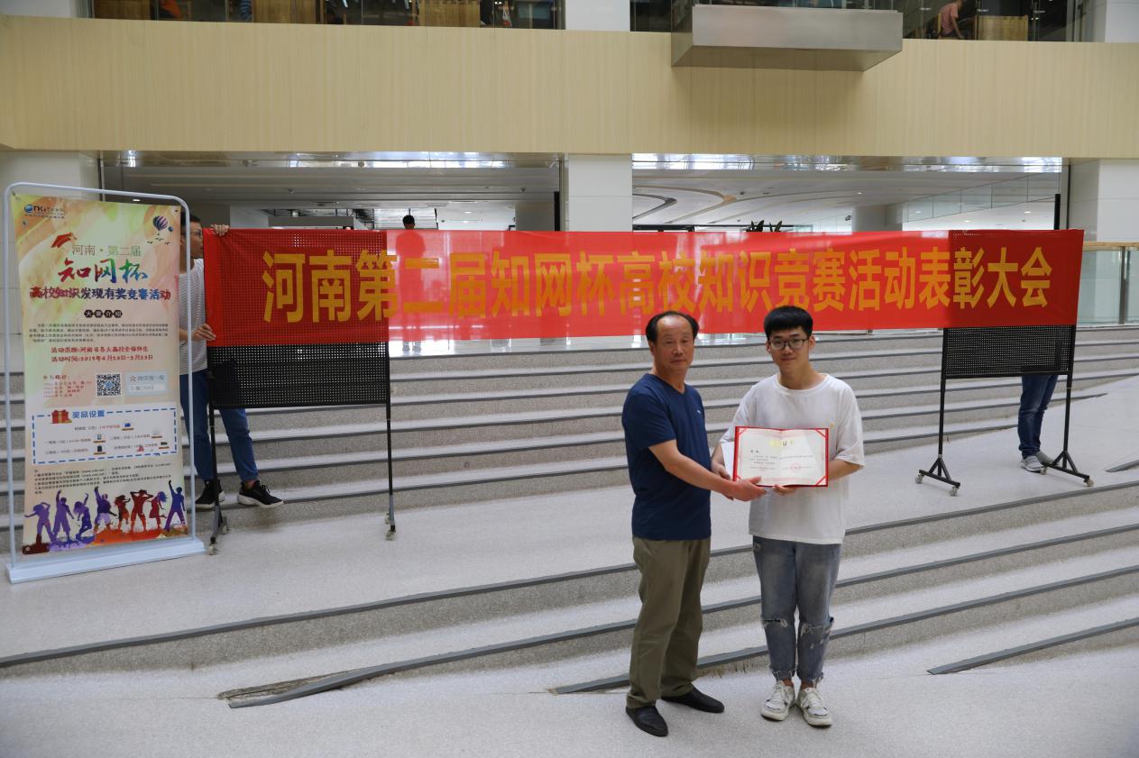 为进一步提升师生信息资源获取能力及素养,助力师生阅读,建设书香校园。在第24个“世界读书日”期间,河南省高等学校图书情报工作委员会与同方知网(北京)技术有限公司河南分公司于4月23日-5月23日联合举办“河南省第二届“知网杯”高校知识发现有奖竞赛活动”。我院图书馆积极组织师生参与此活动。 经过一个月的激烈比拼,我院精诚书院殷凯同学荣获特等奖,冯晨阳同学荣获三等奖。同方知网(北京)技术有限公司河南分公司于6月19 日在图书馆一楼中庭举办了颁奖仪式,图书馆馆长华玉民作为颁奖嘉宾为他们颁奖。其中,特等奖全省两名,我校殷凯同学占据其一。 殷凯、冯晨阳同学能在此次全省高校参与读者中获得优异成绩,说明我校师生热爱读书、善于学习,熟练掌握知识发现挖掘的技能,对于今后学习工作会终身受益,同时也是对我院图书馆阅读推广工作的鼓励和肯定。今后,我馆将进一步解放思想,创造性地开展阅读推广活动,为师生提供更多更好的阅读展示平台,助推书香校园建设更快更好的发展。