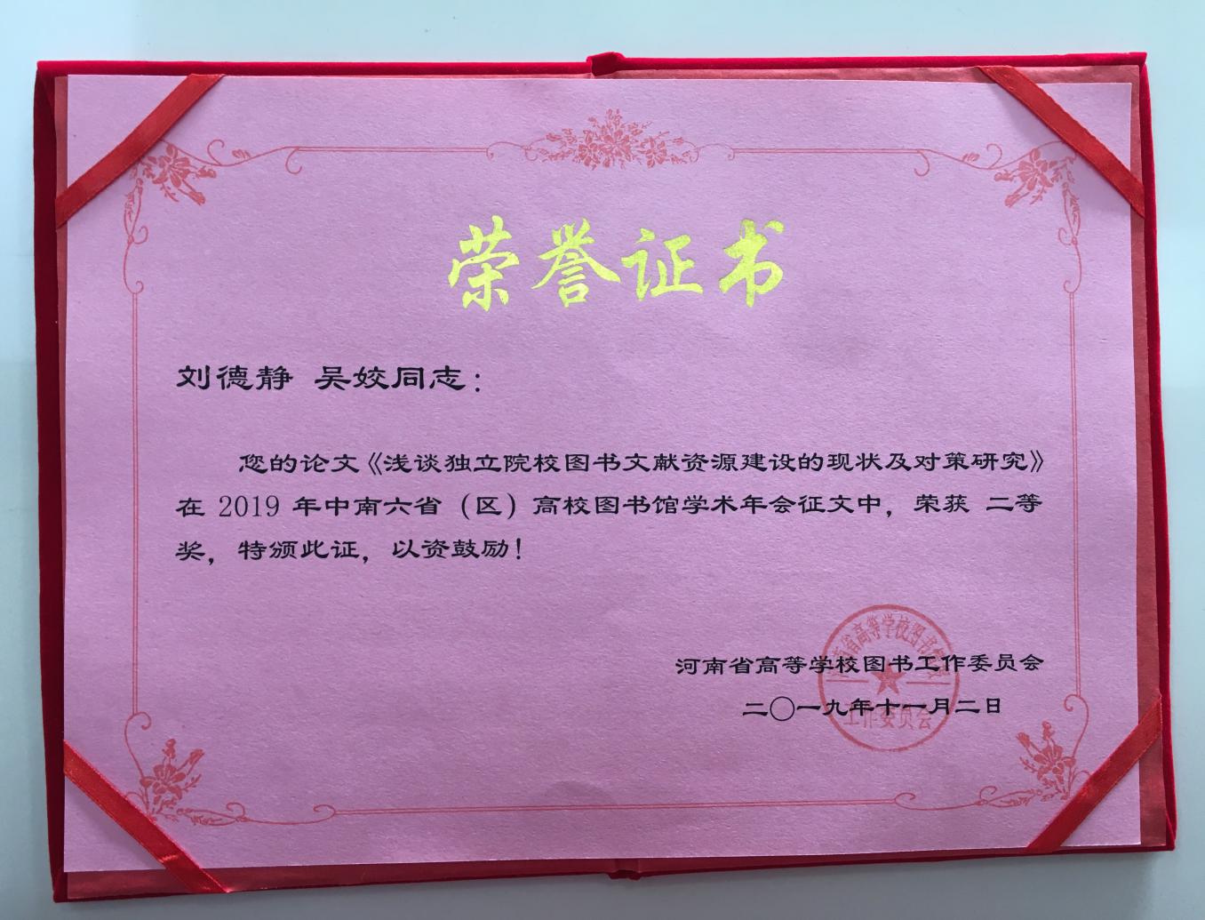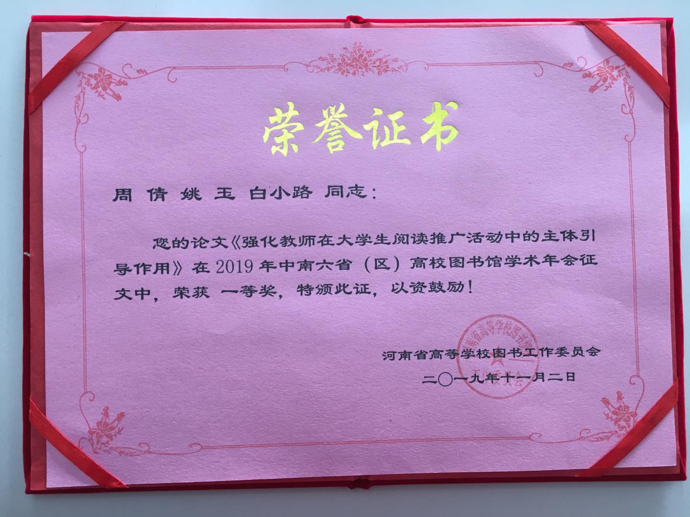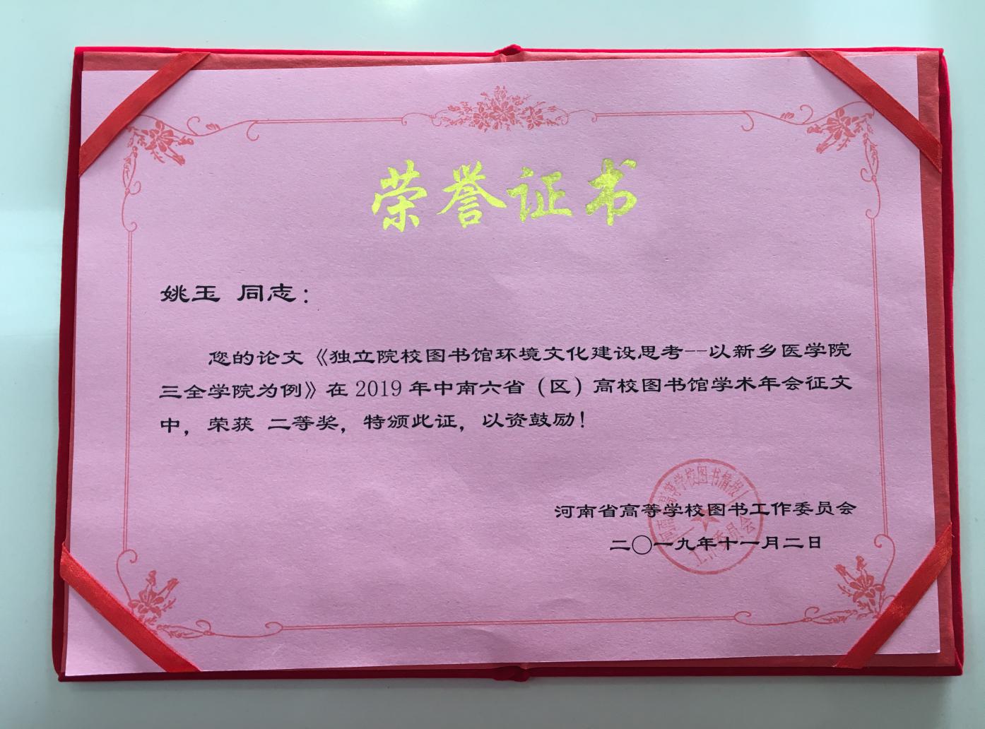 2019年中南六省(区)高校图书馆学术年会于11月2日--4日在河南洛阳市举行,本次年会的主题为“变革新时代,共创大学图书馆的未来”。此次年会由河南省高校图工委承办,河南科技大学图书馆、郑州大学信息管理学院协办,河南省教育厅副处长张小茜、河南科技大学副校长李全安、大会特邀专家、六省高校图工委秘书长出席会议,来自中南六省各高校图书馆三百余名代表参加了会议。我馆馆长华玉民和论文获奖者周倩、姚玉参加此次年会。 此次年会征文共收到投稿论文196篇,我校图书馆共有3篇论文获奖。我馆周倩、姚玉、白小路合作撰写的《强化教师在大学生阅读推广活动中的主体引导作用》获得一等奖;刘德静、吴姣合作撰写的《浅谈独立院校图书馆文献资源建设的现状及对策研究》、姚玉独立撰写的《独立院校图书馆环境文化建设思考--以新乡医学院三全学院为例》获得二等奖,是本届年会获奖论文中独立院校图书馆获奖最多的图书馆,也是我馆近几年论文投稿数量和获奖数量最多的一次。 本次年会旨在进一步推动中南六省(区)高校图书馆的学术交流与合作,共同探讨交流新时代高校图书馆建设和发展中的最新研究成果,展望新时代图书馆事业发展前景。我馆将在此次学术交流会的推动下,继续探索新时代适合独立院校图书馆发展的新途径,在智能信息化服务、阅读推广、服务育人等方面助力学校建设和发展。