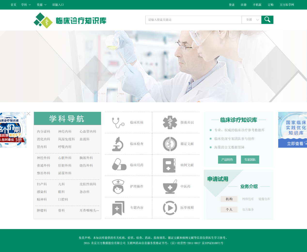 为了更好的服务教学和科研,为全校师生提供优良的文献资源,万方临床诊疗数据库和外文医学期刊数据库将在我校开通试用。欢迎全校师生踊跃使用,并将使用意见反馈给图书馆。 联系人:吴姣 电话:13323809933 数据库访问途径:登陆图书馆主页,点击左下角”资源”栏目,通过“试用数据库”进入万方临床诊疗数据库和外文医学期刊数据库。 数据库简介: 一、万方临床诊疗数据库 1、数据库简介 窗体顶端 临床诊疗知识库以疾病、病症、检查、药品、指南和病例报告为基础,通过整合设计,关联知识点,为读者提供超过常见疾病的知识、病例报告全文、OTC药品的使用说明书,以及症状、检查和药品通用名称等多种医学术语表,师生可以非常方便地查找各类知识条目。内容包含疾病库4000余种、检查库1000余种、药物1500余种和说明书5000余种、指南规范近万篇、循证文献数百万余篇、病例文献上百万余篇。 2、使用链接:http://lczl.med.wanfangdata.com.cn/